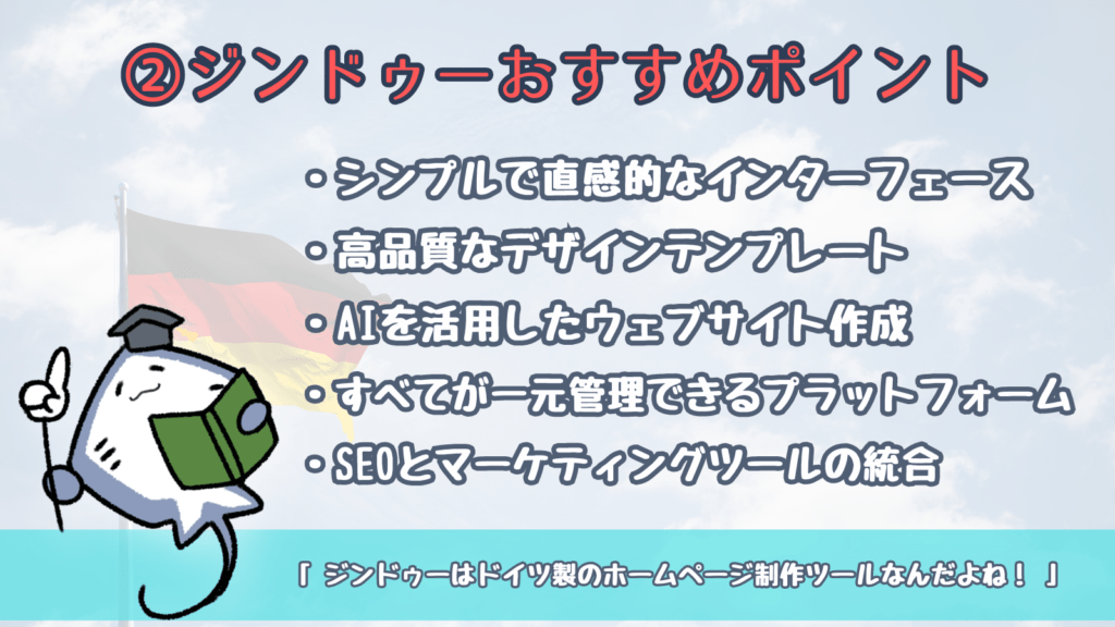 ジンドゥーはこれらの特長により、ウェブサイト作成のプロセスを大幅に簡略化し、初心者でも効率的にかつプロフェッショナルなウェブサイトを立ち上げることができるようになっています。これらの理由から、特にウェブサイト作成に慣れていないユーザーに強くおすすめされるツールです。