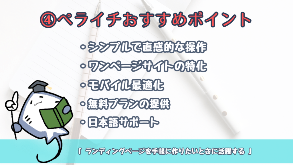 ペライチは、その使いやすさ、シンプルな機能性、モバイル最適化により、特に日本のユーザーにおすすめできるウェブサイトビルダーです。初心者でも手軽に美しいワンページサイトを作成できる点が大きな魅力です。