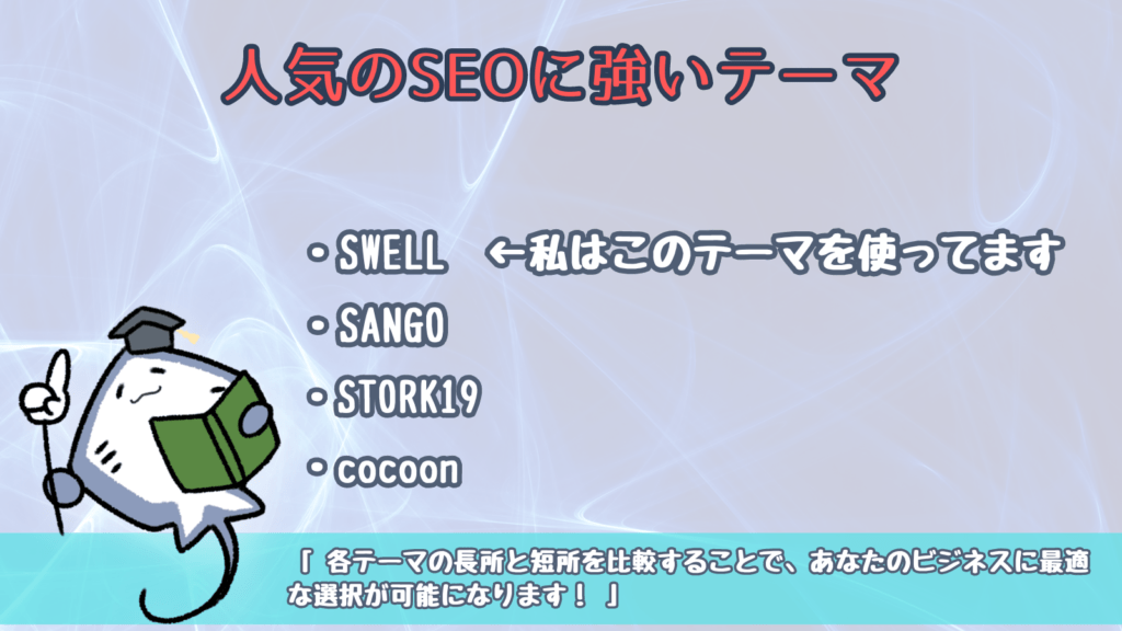 SEOに強いテーマを選ぶ際には、それぞれの特徴を知ることが重要です。例えば、WordPressで有名な「SWELL」や「SANGO」は、SEOの専門家たちから高い評価を受けています。これらのテーマは、速度とカスタマイズの自由度が高く、SEOの基本がしっかりと組み込まれています。また、「STORK19」や「cocoon」も非常に人気があり、視覚的に魅力的で使いやすいインターフェースを提供しています。