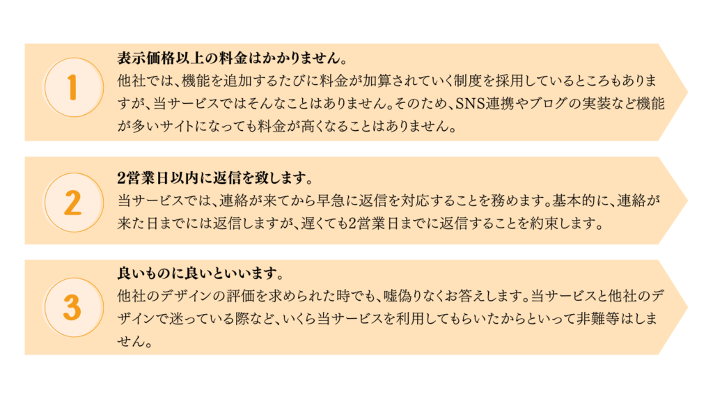 他社のデザインの評価を求められた時でも、嘘偽りなくお答えします。当サービスと他社のデザインで迷っている際など、いくら当サービスを利用してもらいたいからといって非難等は致しません。