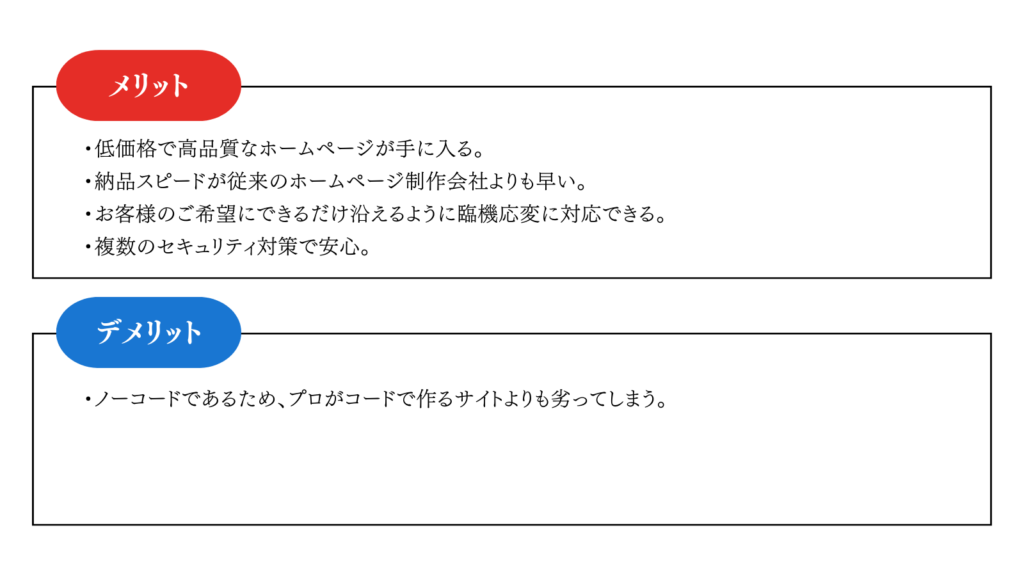 ・ノーコードであるため、プロがコードで作るサイトよりも劣ってしまう。